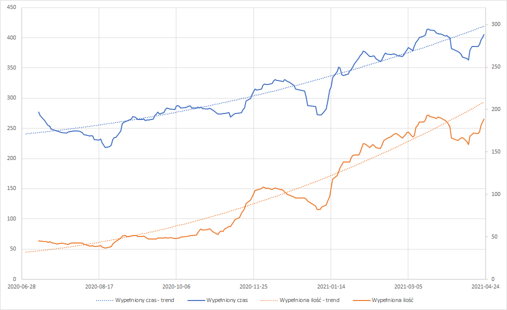 Na wykresie poniżej widzimy, jak w jednym z zakładów produkcyjnych, który wykorzystuje ten sposób monitoringu, rośnie skala uzupełnianych danych operacyjnych dotycząca wytwarzanego produktu oraz procesów.