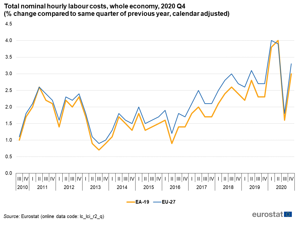 Według Eurostatu, zmiany kosztów pracy na rynku europejskim z perspektywy historycznej przedstawiają się następująco: